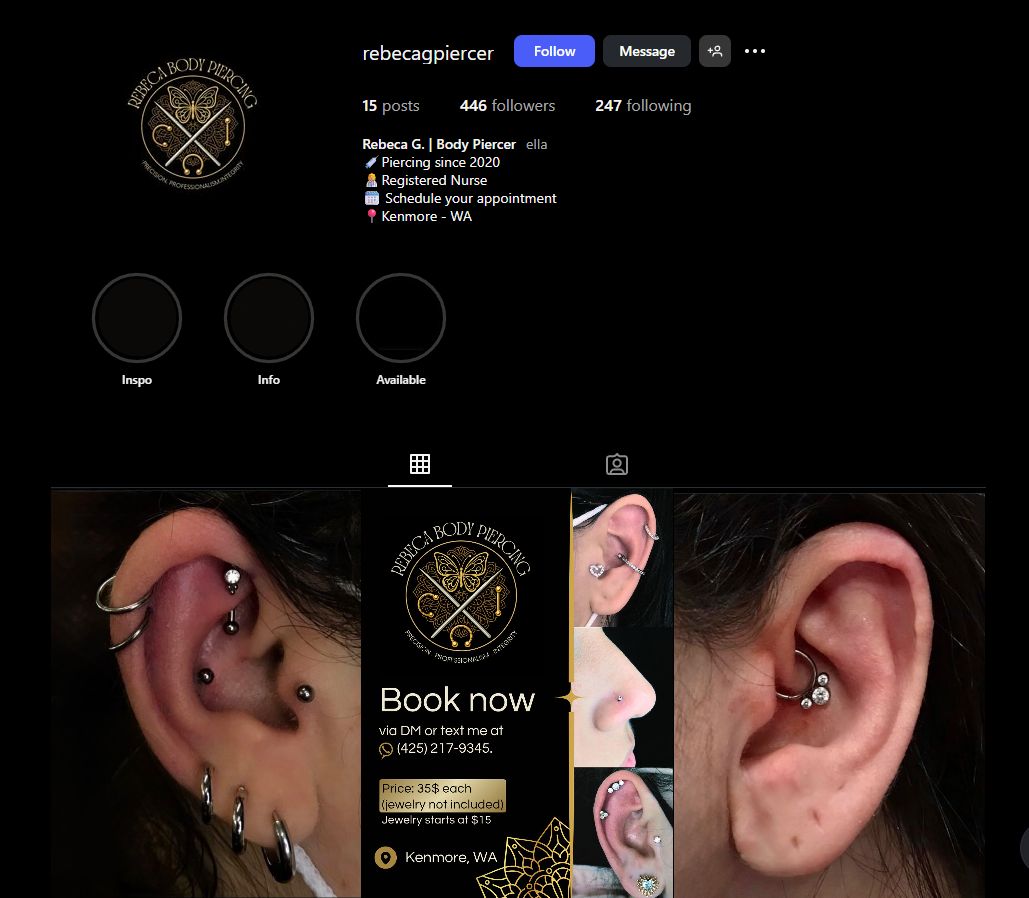 A profissional Rebeca Leandro, body piercer e enfermeira, está oferecendo atendimentos especializados na região de Seattle. O estúdio, localizado em Kenmore (Bothell Way), segue normas de biossegurança, utilizando apenas materiais esterilizados e descartáveis.