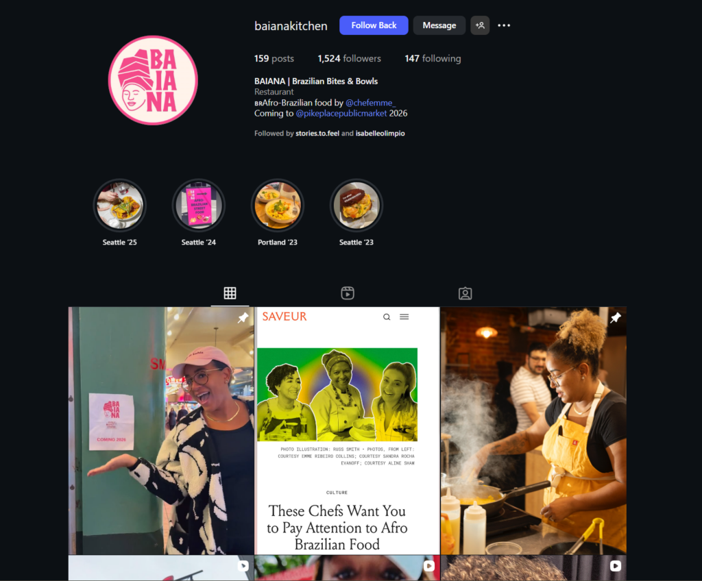 No último dia 16, a chef Emme Ribeiro Collins anunciou oficialmente a abertura do Baiana Kitchen no Pike Place Market, um dos espaços gastronômicos mais emblemáticos de Seattle. Ainda sem data divulgada, a chegada do restaurante marca um novo capítulo para a culinária brasileira na cidade, agora em endereço fixo, após anos de sucesso em formatos temporários.