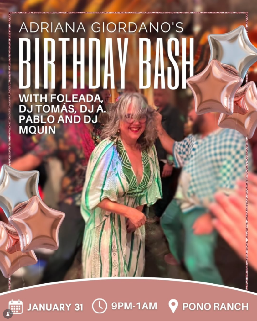 A festa celebra o aniversário de Adriana Giordano, cantora, percussionista e uma das vozes mais conhecidas do forró brasileiro na região de Seattle. Adriana é vocalista da Foleada e atua há anos na cena cultural local, contribuindo para a divulgação da música brasileira e para a criação de espaços de encontro por meio da arte e da dança.